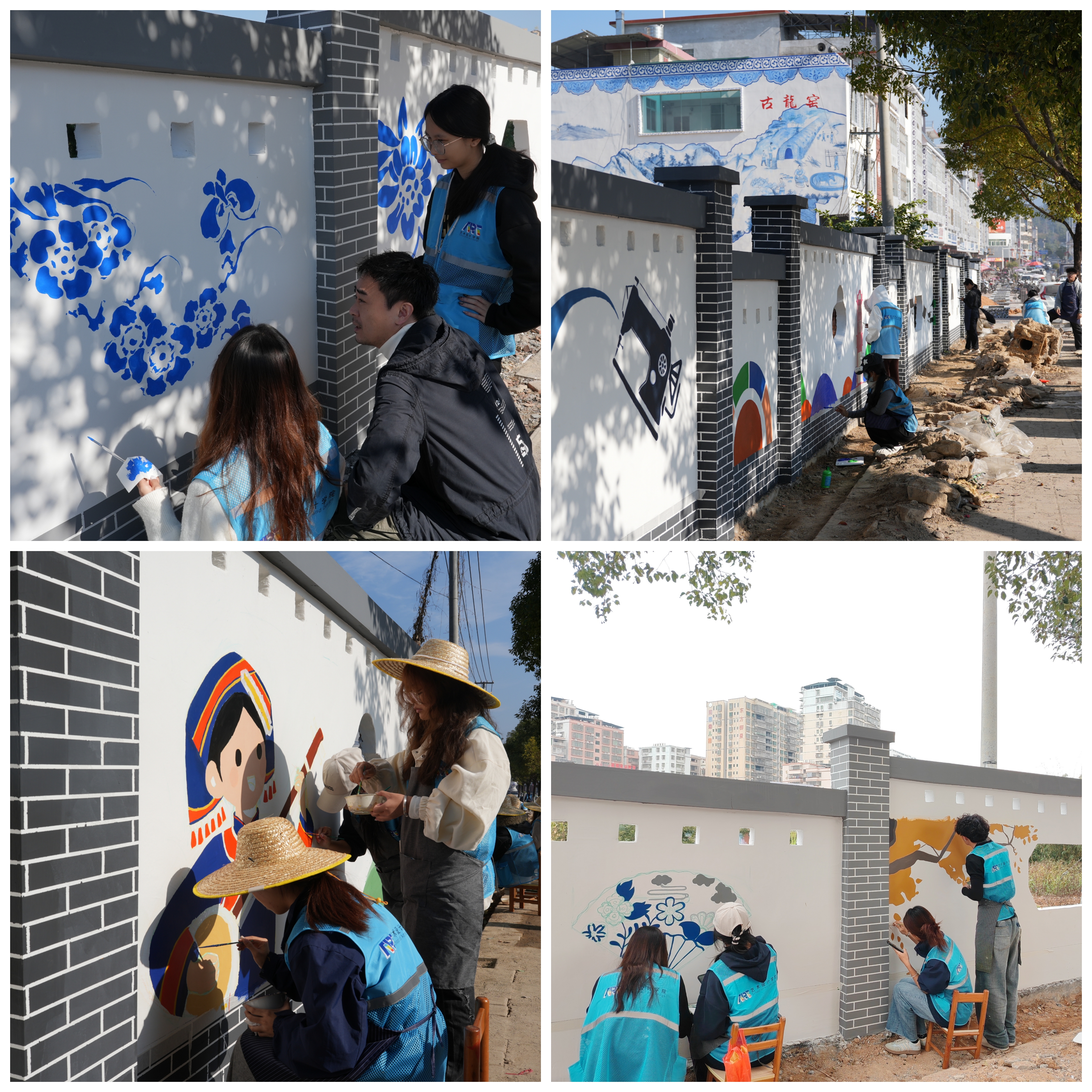为深入贯彻广东省“百县千镇万村高质量发展工程”部署,推动乡村文化振兴与艺术实践深度融合,2025年12月26日,广东工程职业技术学院艺术设计学院“艺绘梦想队”40余名师生,在学院党委书记吴文丰的带领下,奔赴“中国青花瓷特色小镇”——梅州市大埔县高陂镇,在青花瓷公园开展以“青花瓷韵·艺绘高陂”为主题的大型墙绘创作活动。师生们以笔为媒、以墙为纸,用艺术活化乡土文化,为高陂镇乡村振兴注入青春动能。