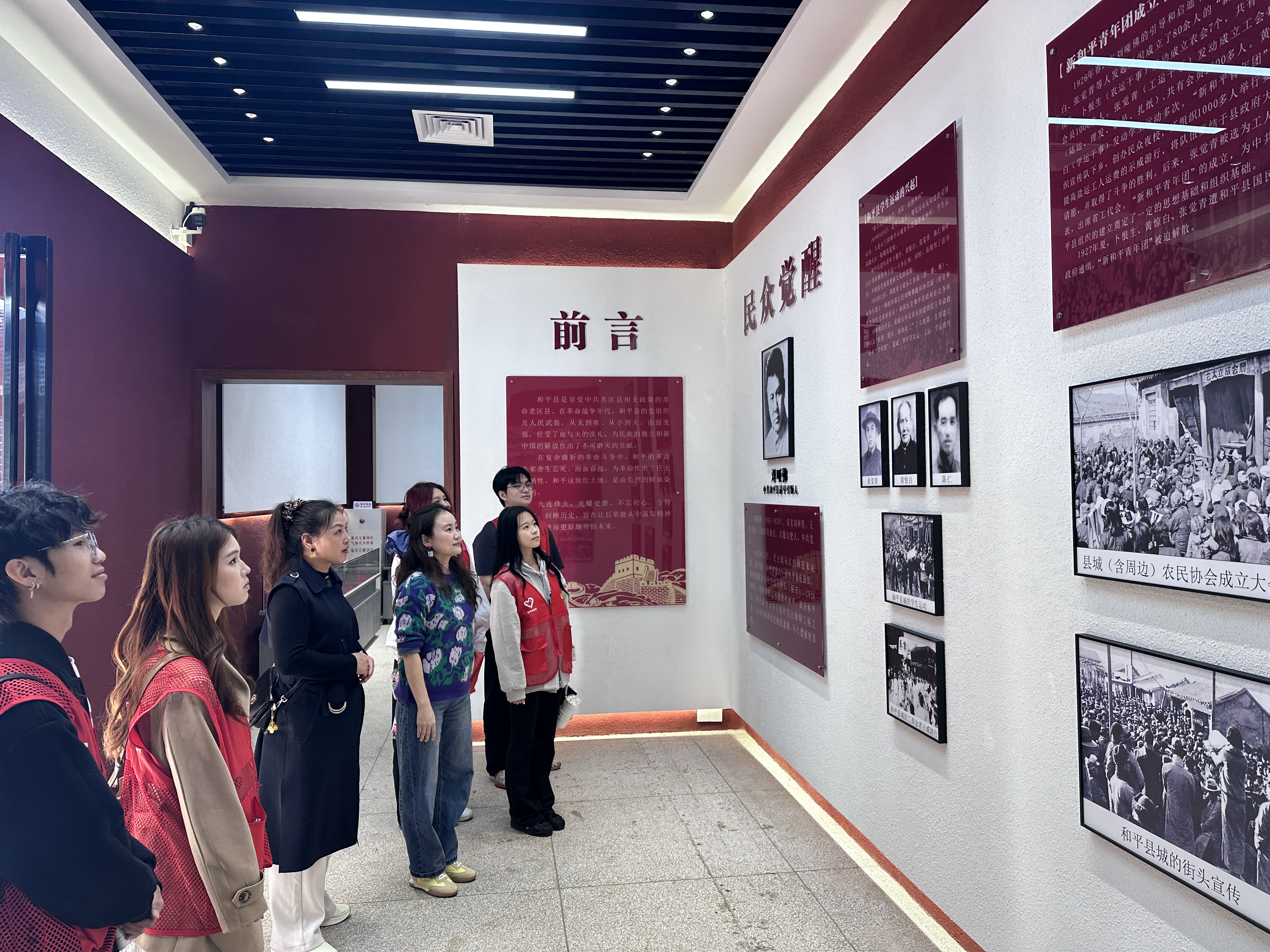 在九连地区革命历史纪念馆,师生在讲解员的引导下,系统学习了解放战争时期九连地区人民武装发展历程。从“争取和平与民主斗争时期”到“全区解放时期”的序列展板前,大家驻足凝视,通过珍贵的图文史料、实物展品与场景复原,重温广东人民解放军粤赣边支队、中国人民解放军粤赣湘边纵队东江第二支队的战斗历程,深刻感悟革命先辈在九连山区浴血奋战、保家卫国的初心使命。队员们认真聆听和平县民众觉醒、农民运动兴起的革命故事,在一张张老照片、一件件革命文物前驻足沉思,深刻认识到和平县作为粤北革命老区的红色底蕴,切实体会到“没有革命先辈的流血牺牲,就没有今天的幸福生活”的厚重内涵,在沉浸式学习中传承红色基因、汲取奋进力量。