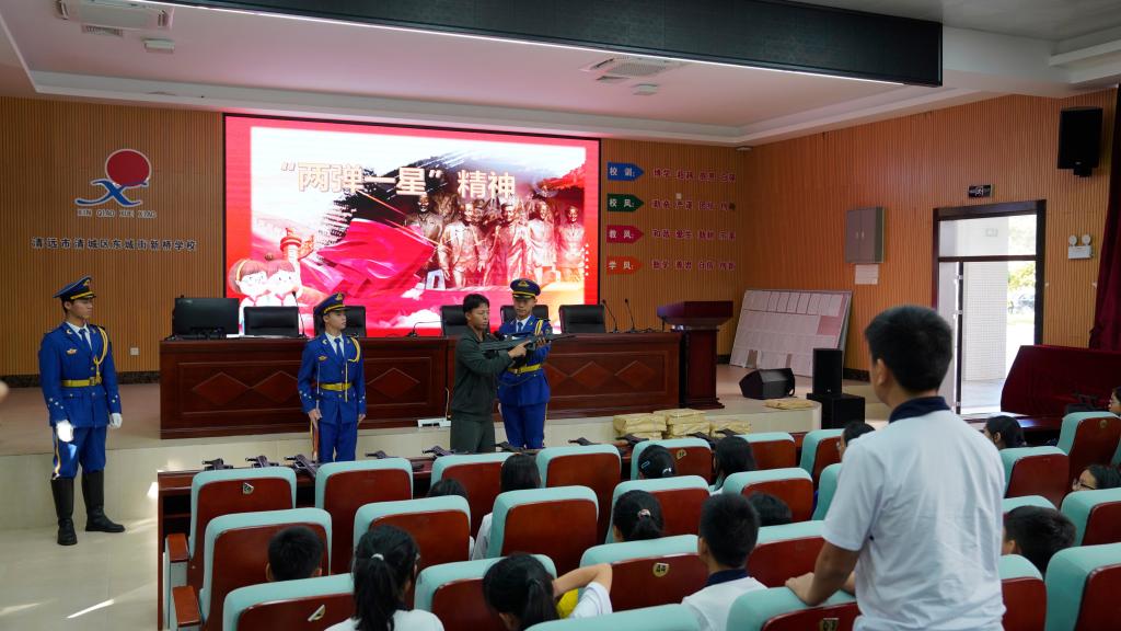 升旗仪式结束后,爱国主义宣讲会在新桥学校报告厅举行。国护队红色宣讲团队员以“讲故事”的形式,用孩子们听得懂、感兴趣的方式,讲述钱学森等“两弹一星”科学家的深厚的家国情怀和工匠精神。学生认真听讲,队员们耐心解答,引导学生步步了解正是当年无数革命先辈无惧牺牲和艰辛付出才有了今天的来之不易的幸福生活,而这种无私奉献的精神,需要一代又一代传承下去。